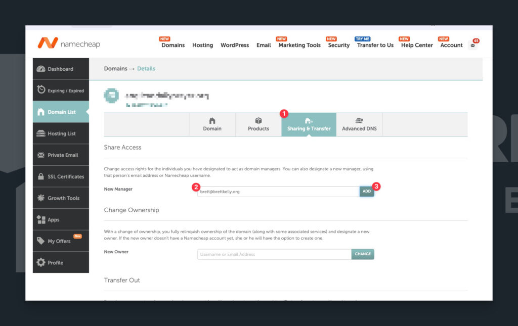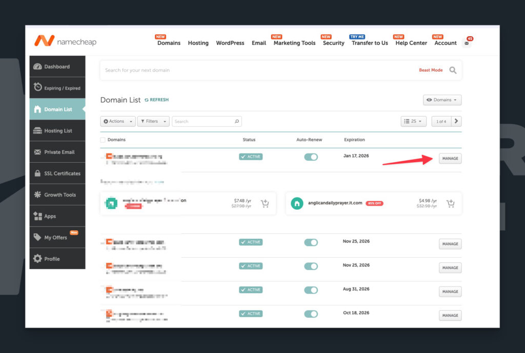 - Find the domain you’d like to grant me access to, then click “Manage”